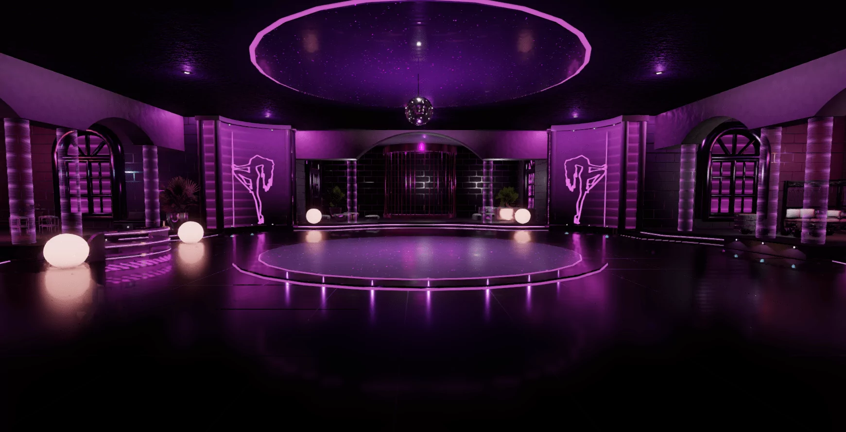 A DJ area, a VIP lounge, restrooms, drink and candy dispensers, a lounge area, a huge bar filled with the most delicious drinks, pole dance ,all filled with poses everywhere!