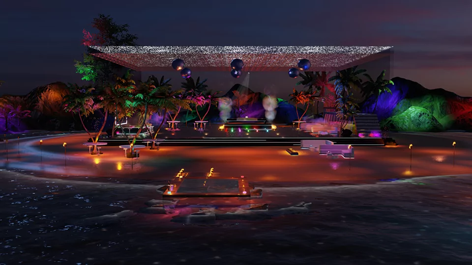 An exclusive nightclub by the sea! Drink and cigarette dispenser, pole dancing poses, modern chairs with LED-lit tables.