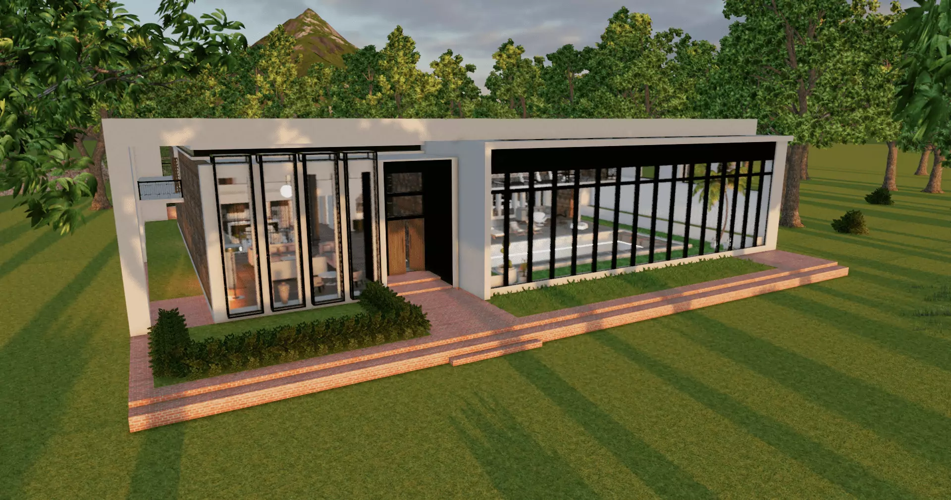 Luxury three-bedroom apartment with art deco influences. Exterior features a blend of concrete and bricks, giving it an industrial yet refined look. Vast living spaces are filled with natural light from large windows. The living room boasts a plush sofa set and a showcase of art pieces, adjacent to a modern kitchen complete with high-end appliances and a dining area.