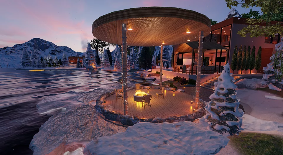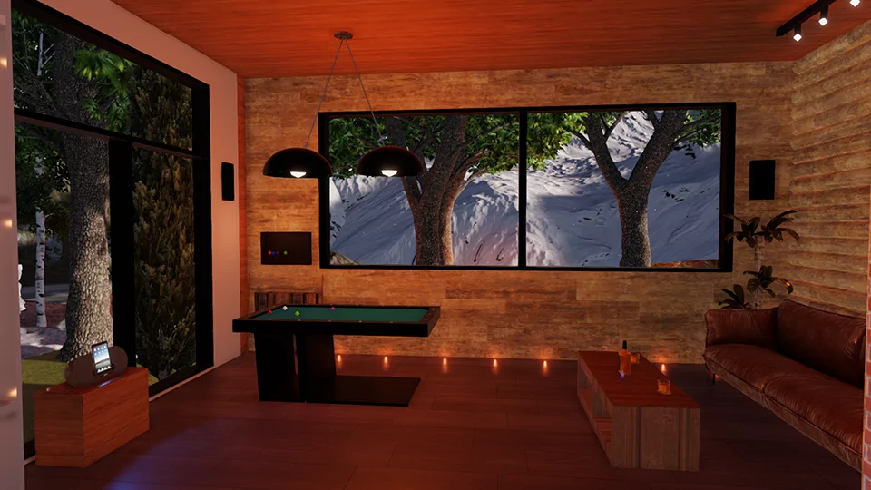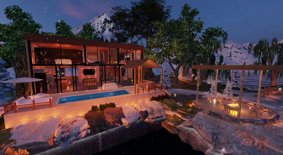 By day, sunlight illuminates the snow-covered pines and the pool invites you to relax. At night, the magic of the campfire, the warmth of the fireplace, and the private cinema make every moment unforgettable.