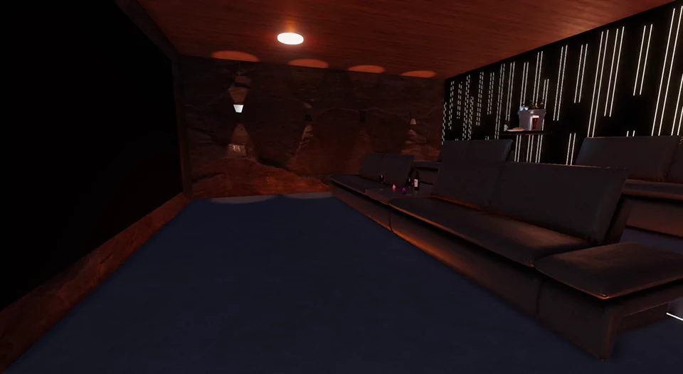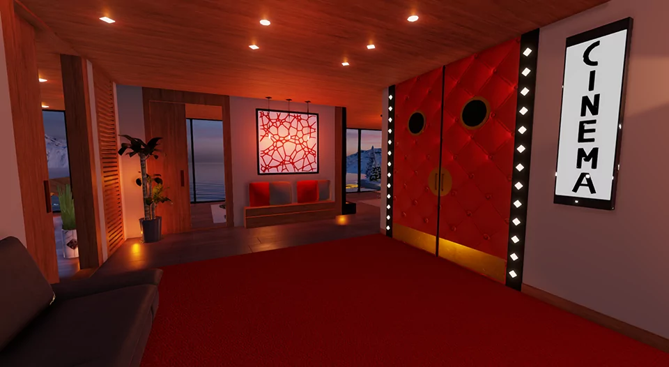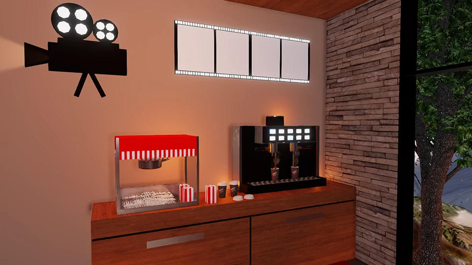 A private cinema next to a relaxation room has a vending machine for drinks and e-cigarettes, a coffee machine, and popcorn.