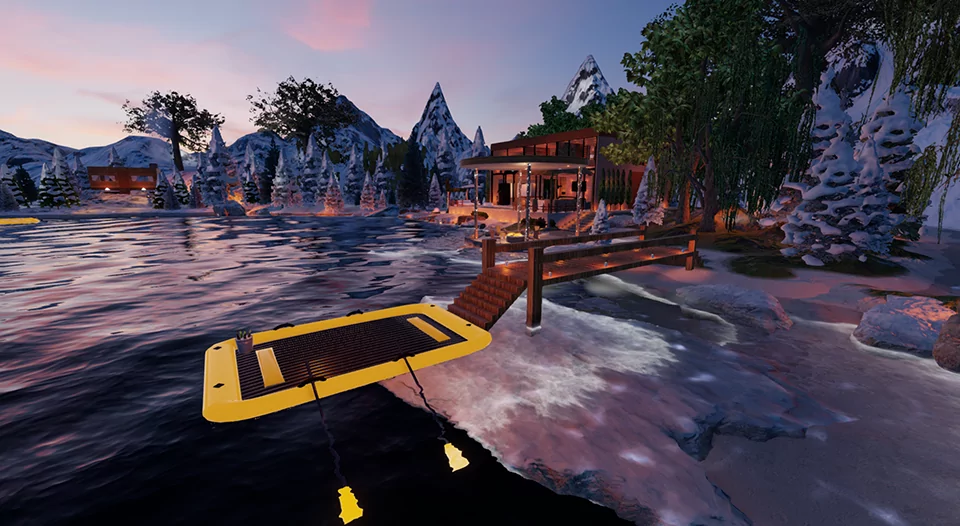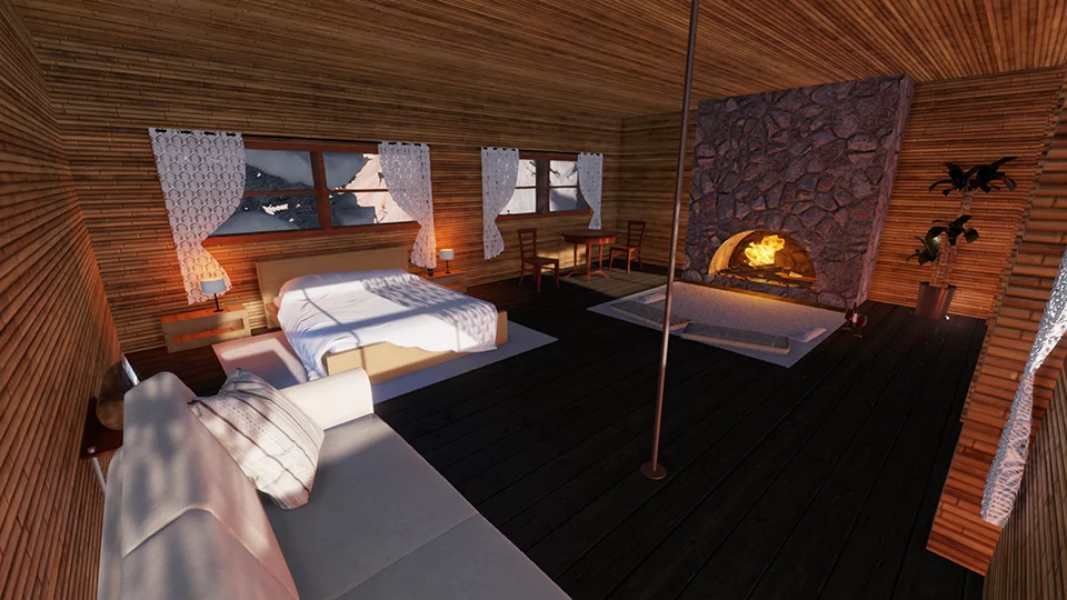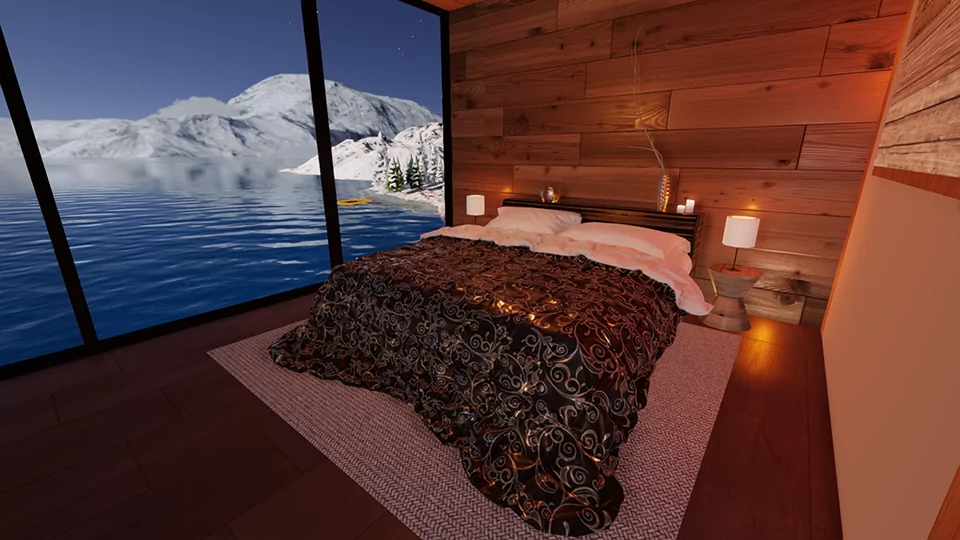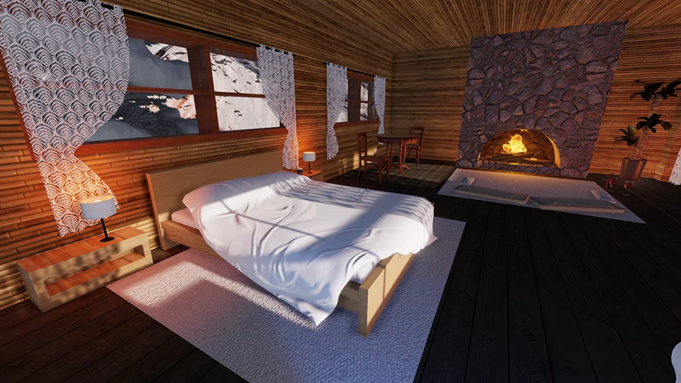 when you teleport, you’ll arrive at a cozy room in the middle of the mountains where you can relax by the river, with a beautiful fireplace and lovely poses!!