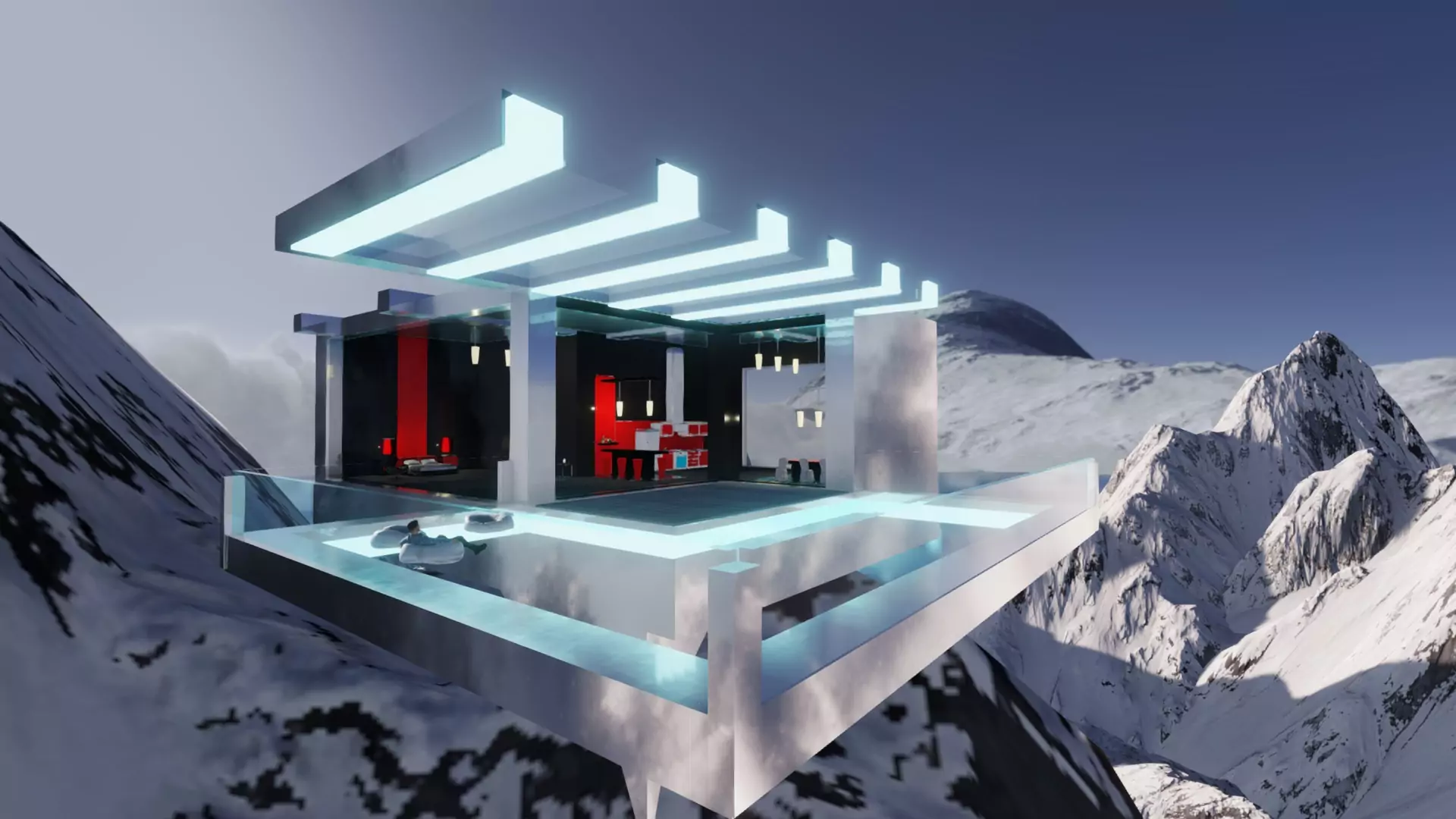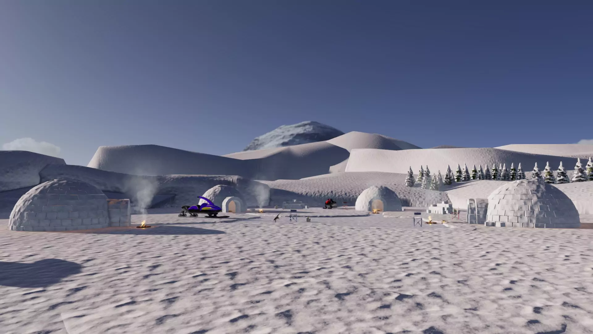 A Polar village of igloos nestled on a frozen, fractured sea. Snowmobiles are scattered across the snowy landscape, while polar bears roam in the distance. Orcas glide through the icy waters, seals rest on the ice floes, and penguins waddle along the snow-covered ground. The scene captures the raw beauty and diverse wildlife of the Arctic frontier.Quick View