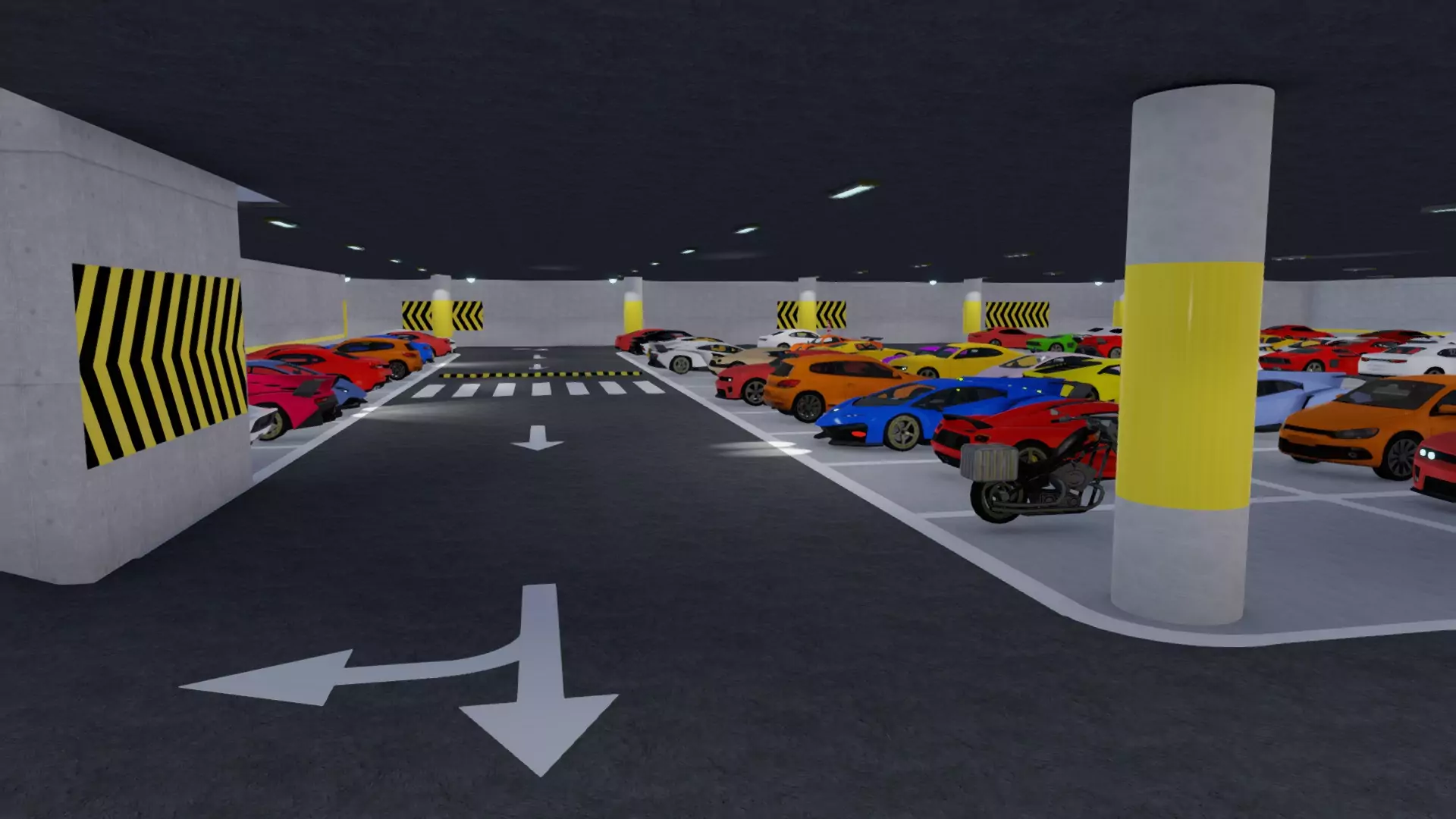A vast underground parking garage spanning three levels, featuring modern lighting, parked and cars, and realistic vehicle poses. The environment has a slightly industrial, concrete aesthetic with illuminated pathways, reflections on polished floors, and dynamic light sources that highlight the vehicles and structure.